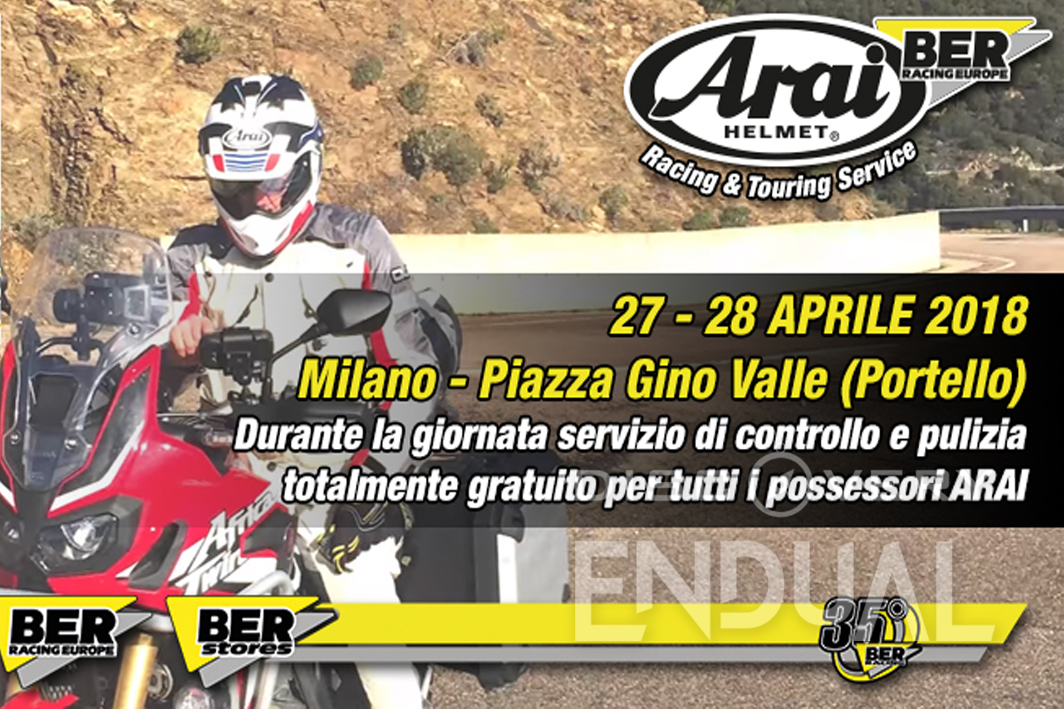 Arai e BER Racing, vista la lunga relazione che li lega all’organizzatore Renato Zocchi (Dakariano e 1° italiano a vincere una manche di Campionato del Mondo MX su Cagiva) sono partner ufficiali dell’evento e saranno lieti di offrire il Servizio Arai Racing & Touring Service in forma del tutto gratuita a tutti i possessori Arai che prenderanno parte al Tour!