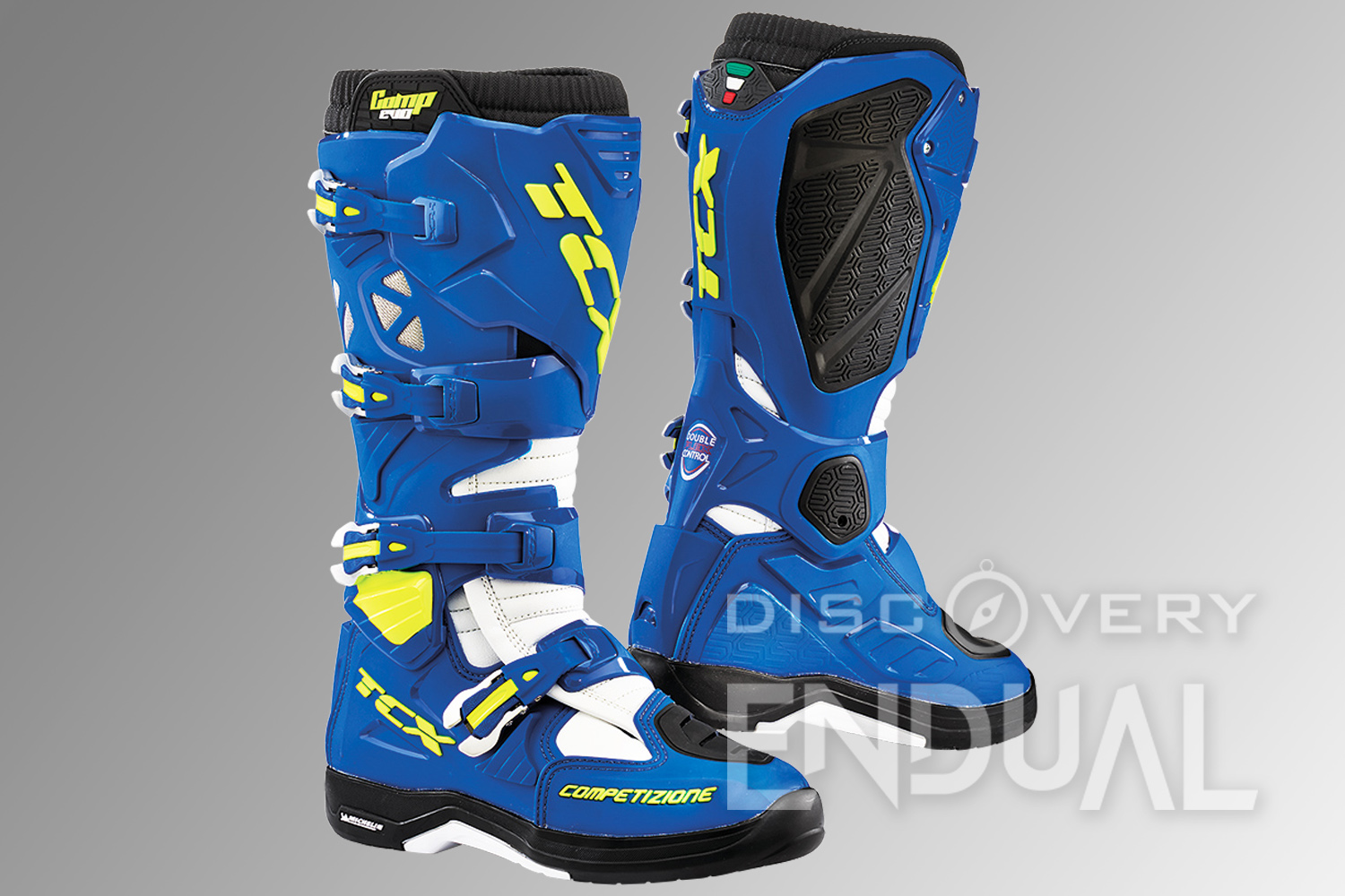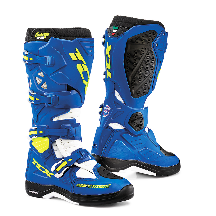 COMP EVO 2 MICHELIN® veste la SUOLA MICHELIN® MX HYBRID, nata dalla collaborazione tra TCX® e MICHELIN® ed ispirata al pneumatico Multiway 3D, che, oltre a garantire massima trazione e stabilità, conferisce allo stivale maggiore leggerezza e sensibilità nell’utilizzo. La speciale mescola è altamente resistente all’usura ed anche in presenza di pedane molto appuntite rivela alti livelli di durabilità. L’inserimento del nuovo sistema Double Flex Control, dotato di uno snodo in poliuretano posizionato nell’area della caviglia, offre un’ottima flessibilità dell’articolazione avanti/indietro. La tomaia è caratterizzata dalla presenza di un gambale in PU integrato al sistema Double Flex Control che consente un maggiore avvolgimento del polpaccio e protezione per evitare l’ingresso di fango, polvere e detriti. Il gambale in PU è dotato di una protezione in gomma contro il calore, che offre anche un maggiore grip sul telaio della moto. La protezione tibia, è realizzata in poliuretano e presenta un sistema di regolazione studiato per adattarsi perfettamente alle diverse dimensioni del polpaccio.