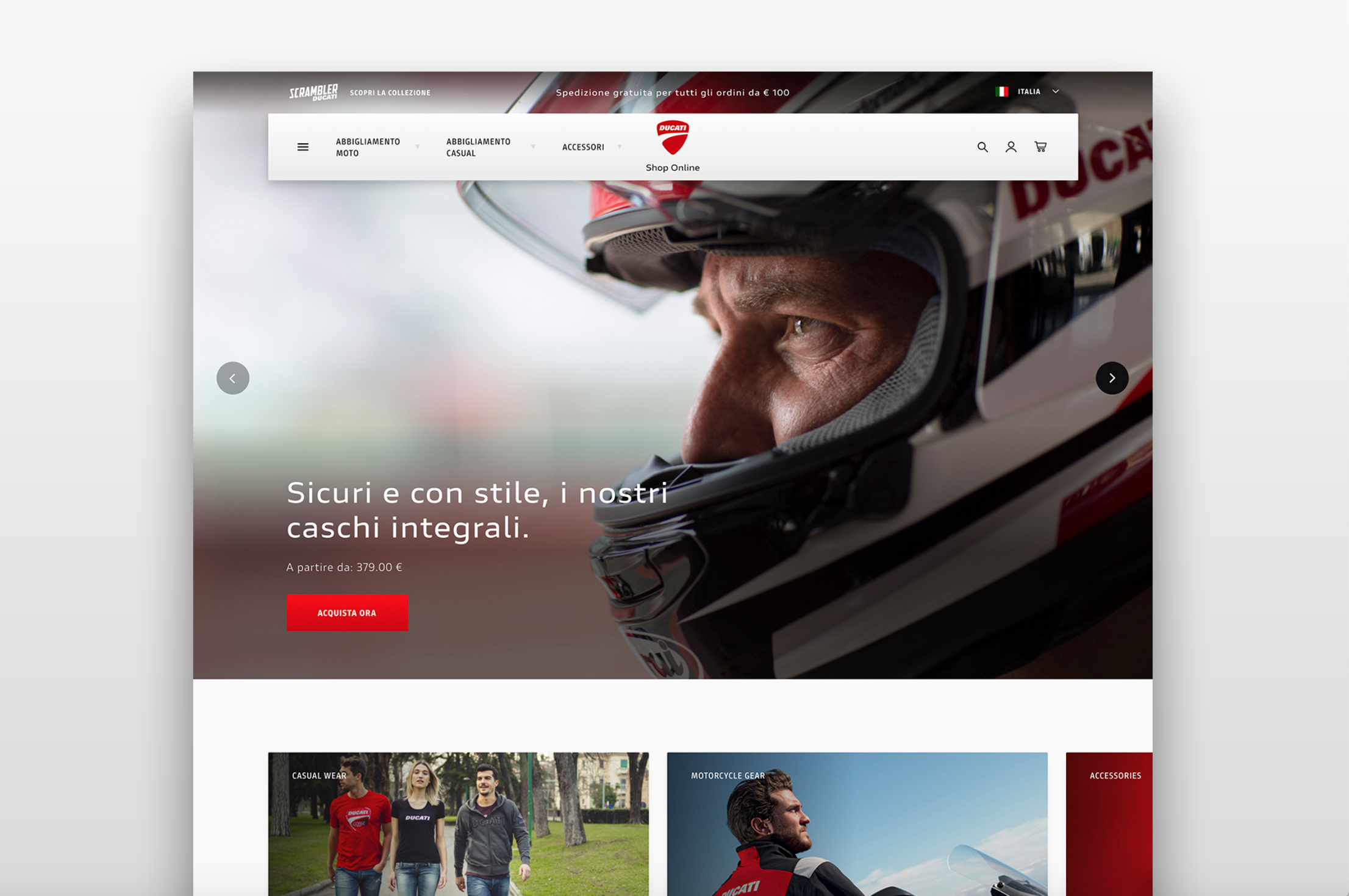 Il nuovo E-shop di Ducati, sviluppato insieme ad Alkemy, società specializzata nell’innovazione del modello di business di grandi e medie aziende, è ora disponibile su shop.ducati.com.
