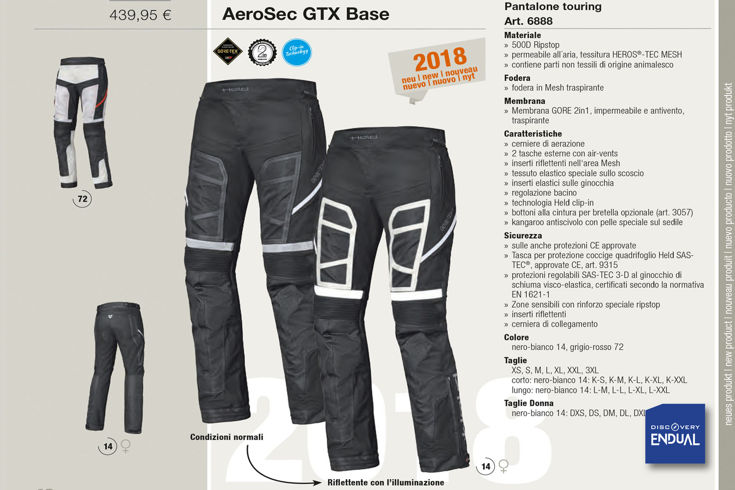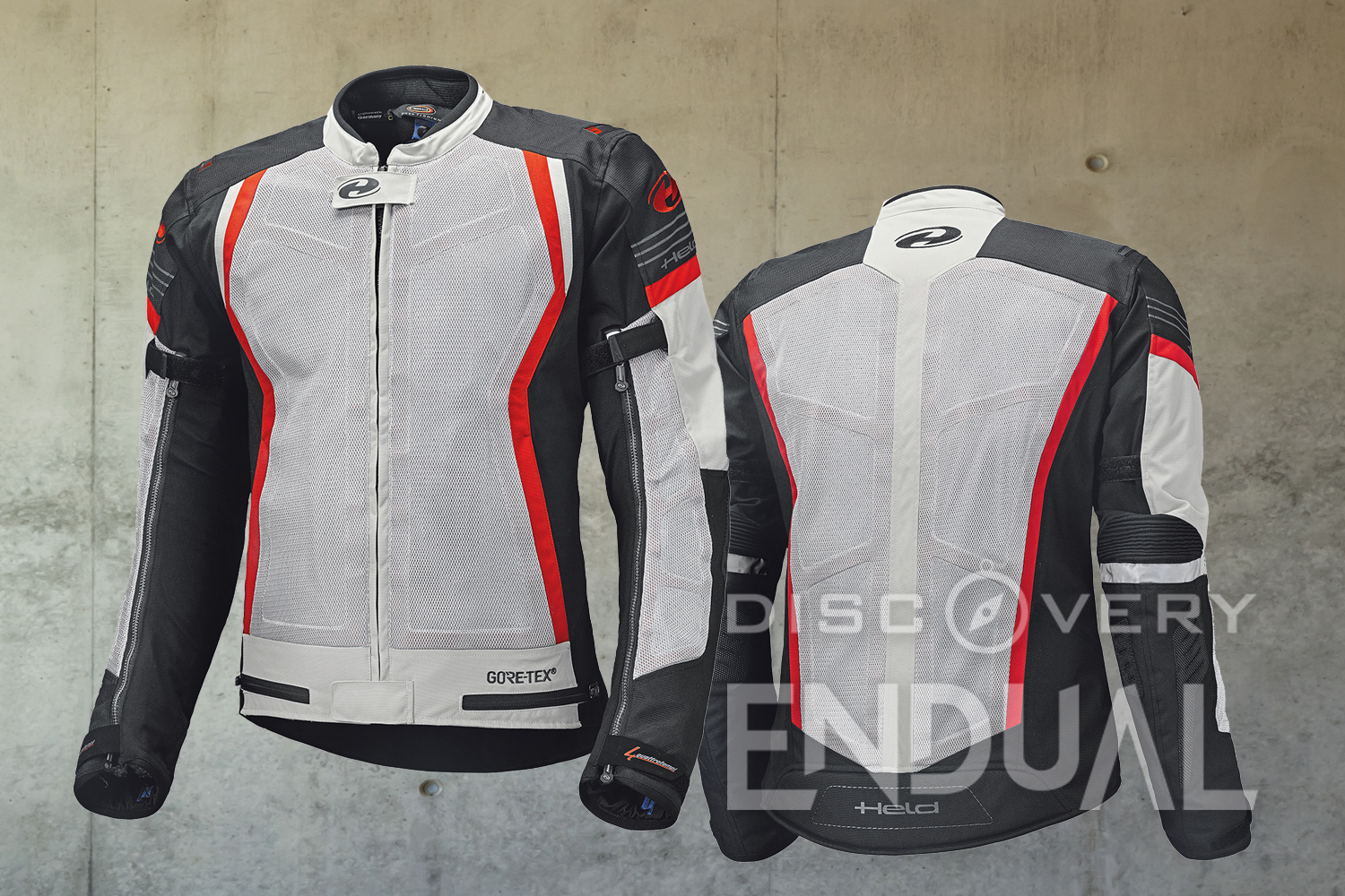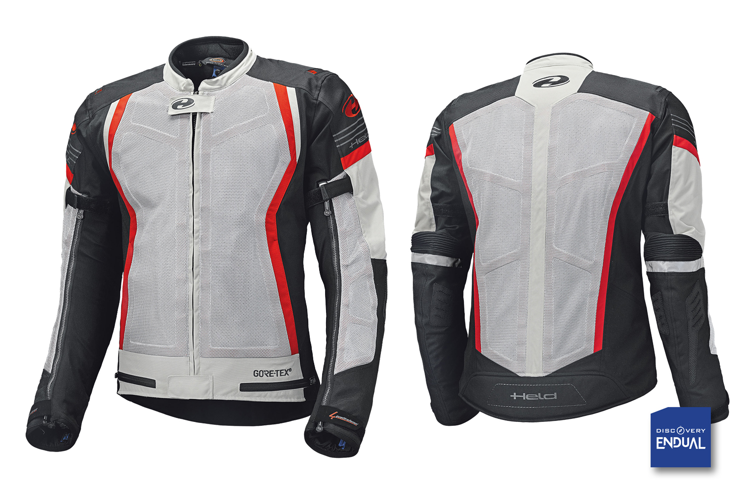 Dotata di due tasche esterne e tre tasche interne, oltre a una dedicata al cellulare e una ai documenti, la giacca Aerosec GTX TOP ha la regolazione in vita e le cerniere per l’aerazione. Nella parte interna del braccio, all’altezza del gomito, è presente una zona “stretch” (allungabile). Le maniche regolabili, gli inserti anteriori e posteriori riflettenti in tutta l’area “mesh”, la tecnologia Held “Clip-In” (il sistema di aggancio dedicato ai pantaloni) e il colletto in morbido tessuto completano le caratteristiche funzionali ed estetiche.