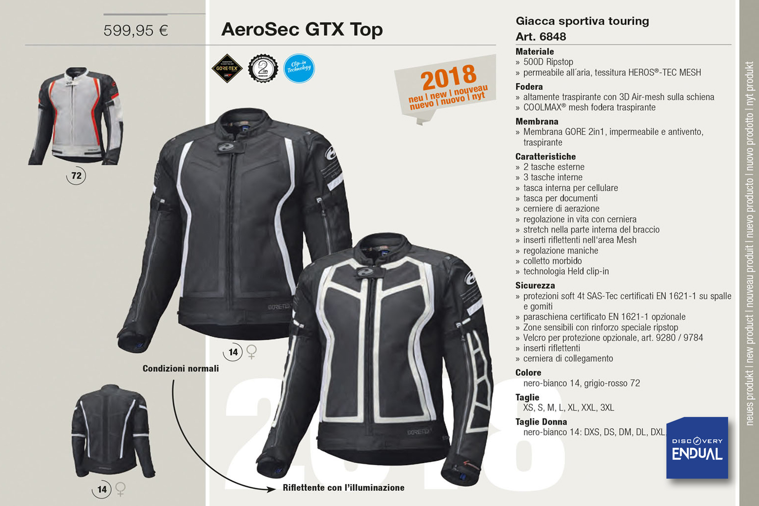 La giacca Aerosec GTX TOP è disponibile nei colori nero-bianco (14) e grigio-rosso (72) nelle taglie: