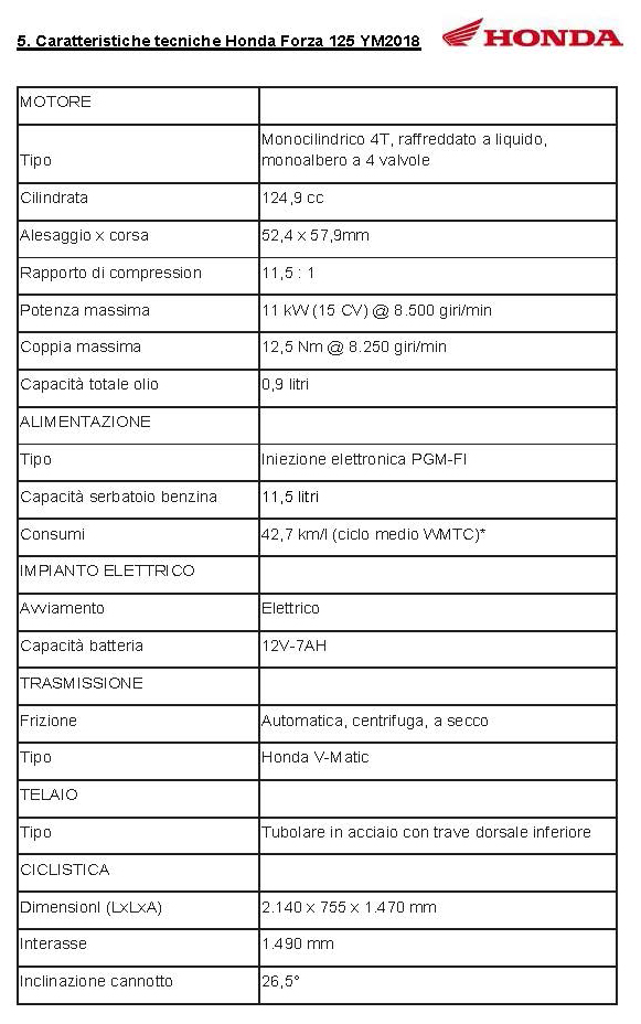 Gli ingredienti principali della ricetta vincente del Forza 125 restano invariati: un motore a 4 valvole che unisce prestazioni al top della categoria ad una eccezionale economicità dei consumi, l’efficiente sistema Start&Stop, un telaio tutto nuovo ma sempre leggero e bilanciato, e un equipaggiamento premium senza paragoni, con luci full-LED, sistema Smart-Key, vano sottosella per due caschi integrali ed elevato comfort per pilota e passeggero