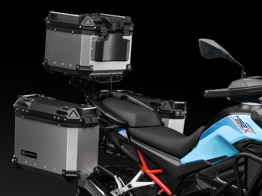 T352X è provvista di portapacchi posteriore ed è compatibile con le soluzioni di carico touring e adventure Morbidelli, che si integrano perfettamente con lo stile della moto e ne ampliano le potenzialità di utilizzo: