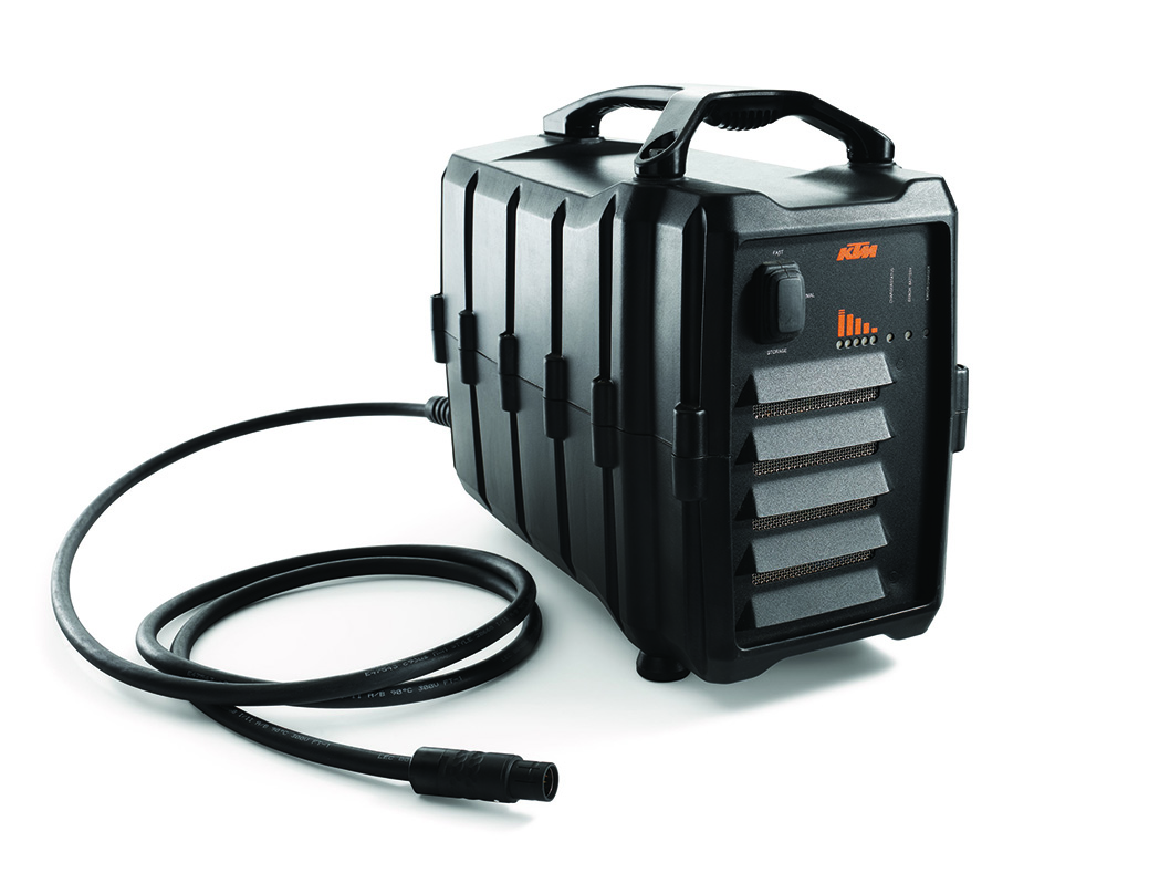 Il tempo di ricarica è di 110 minuti per una carica totale e di 75 minuti per una ricarica dell’80%, mentre il ciclo di vita del PowerPack è di 700 cicli completi, dopodiché KTM garantisce una capacità del 70%.