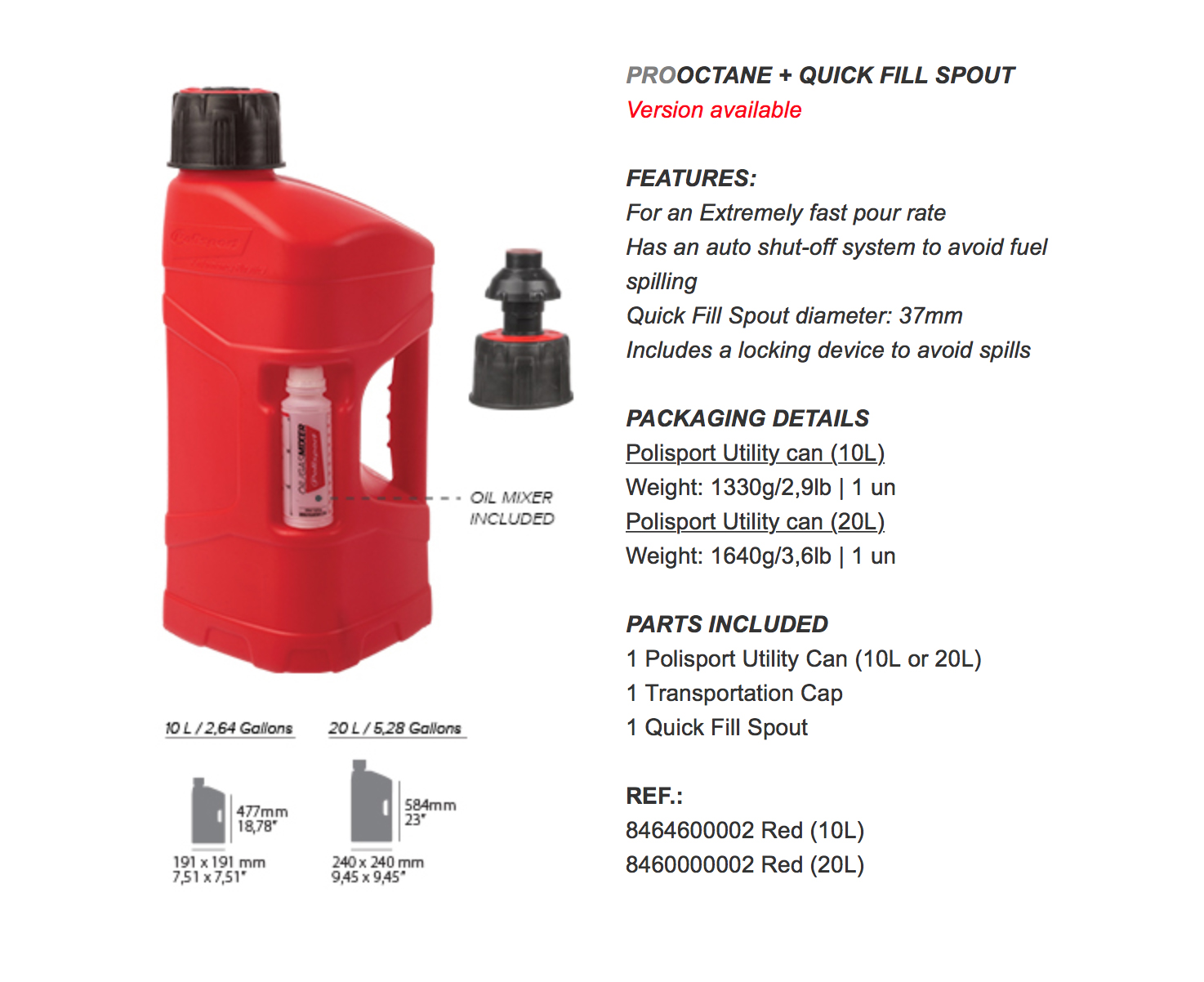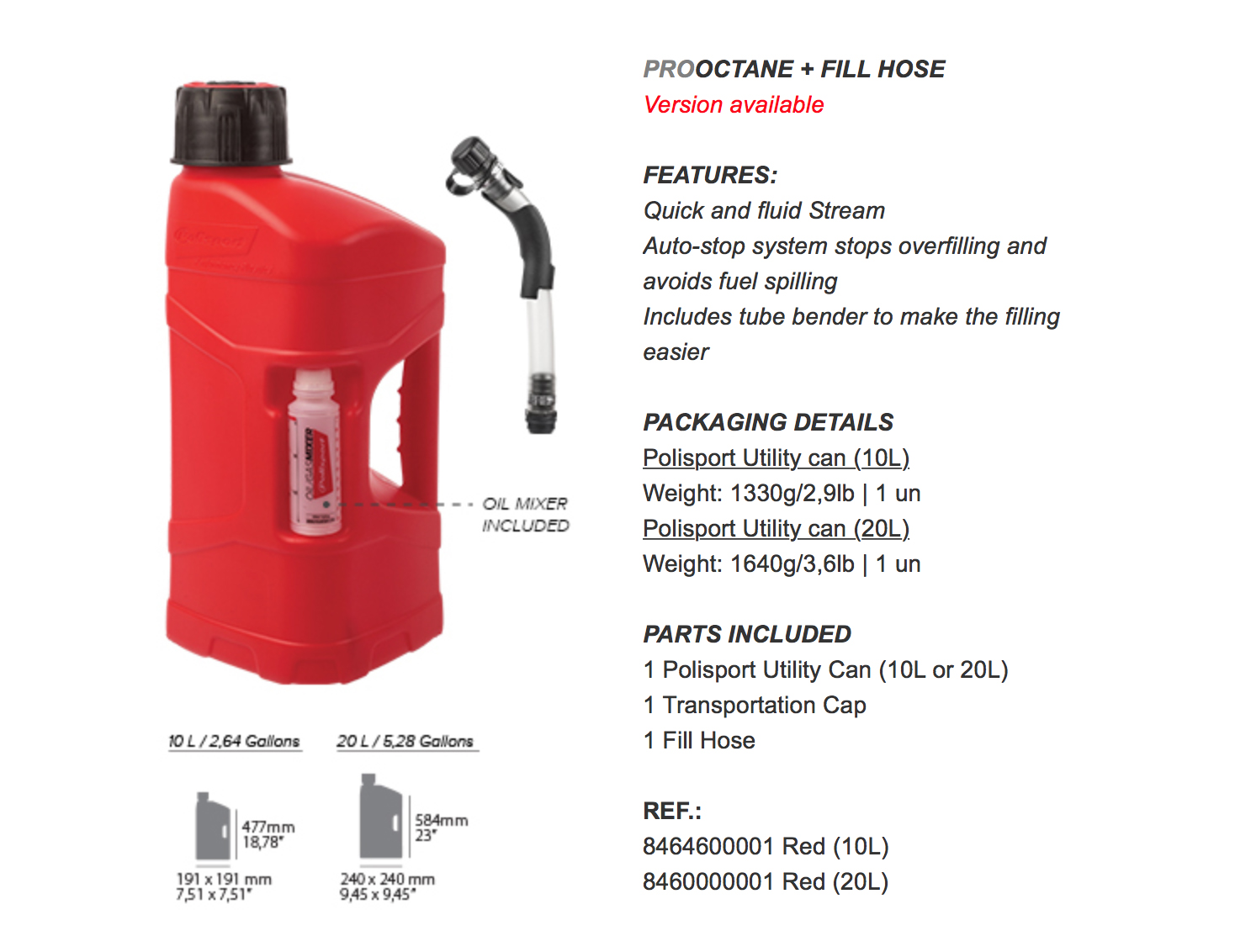Ora Polisport ProOctane sarà disponibile con tubo o sistema Quick Fill incluso. I sistemi di riempimento saranno disponibili per l’acquisto insieme alla versione 10L e 20L, quindi tutto il necessario per rifornire la moto sarà sulla confezione.