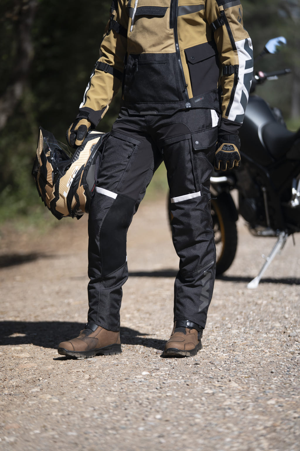 In termini di sicurezza integrano protezioni ginocchia con tripla regolazione in altezza e protezioni fianchi incluse di serie. Nella parte interna delle gambe è stato aggiunto un pannello resistente al calore che protegge dal contatto con il motore o lo scarico. Il design privilegia ergonomia e libertà di movimento, con ampie zone elasticizzate nel cavallo, nella parte posteriore delle gambe e nella zona lombare superiore, facilitando la guida sia da seduti sia in piedi sulle pedane.